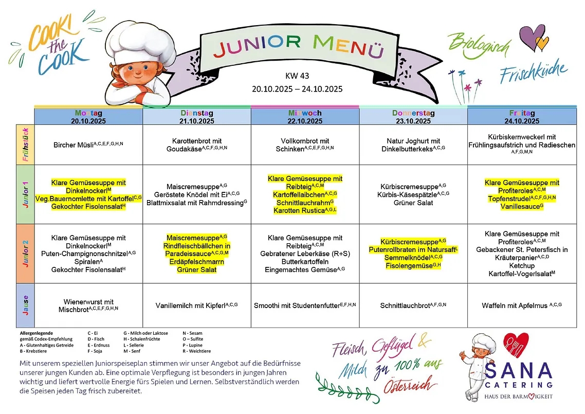 Unser Mittagessen beziehen wir von SANA Catering, die Speisen werden täglich frisch zubereitet und noch warm geliefert. Für die Kinder im RosenMeer Kindergarten in 1140 Wien gibt es Frühstück, Mittagessen, Jause und Obstjause.